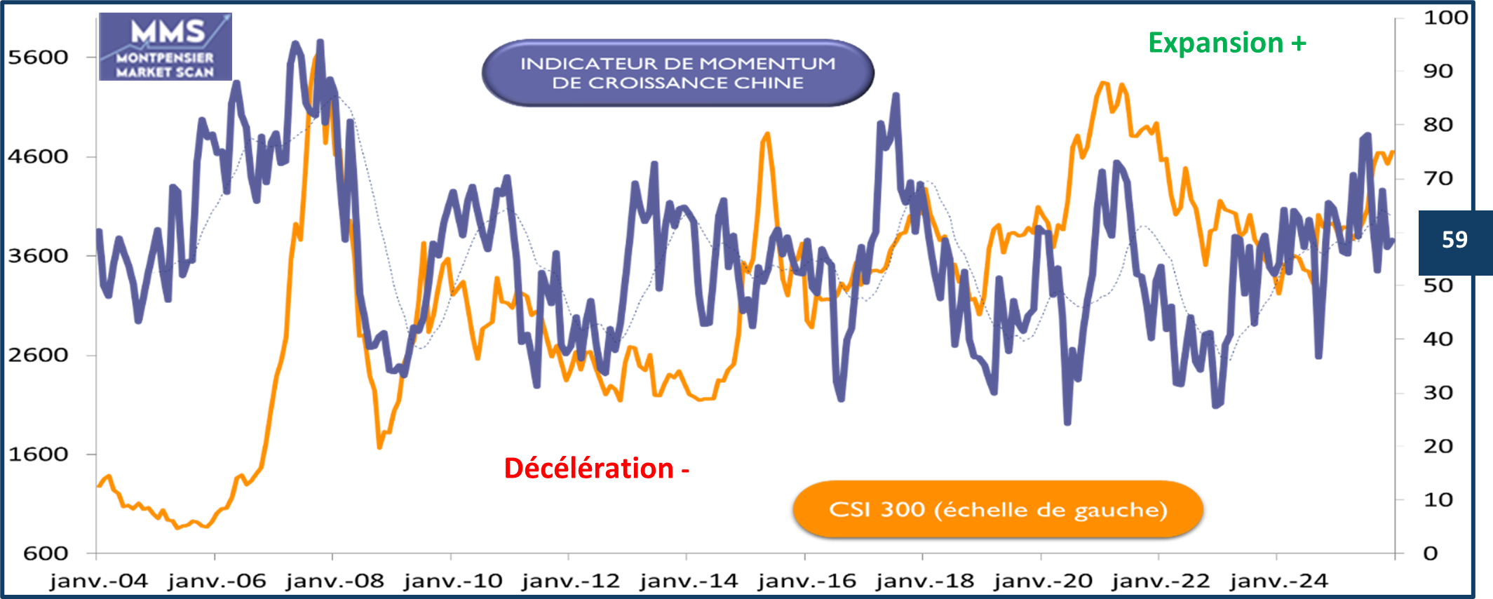 Mais, avec une focale un peu plus étroite, le diagnostic présente de multiples zones d’ombre. Notre indicateur Montpensier Arbevel de momentum économique oscille d’ailleurs depuis plusieurs mois autour du seuil d’expansion. Plus inquiétant, la déflation des prix à la production persiste depuis trois ans en raison des surcapacités massives, les profits industriels ont chuté de plus de 13% en novembre et la demande intérieure demeure insuffisante, plombée par des ménages qui souffrent d’une crise immobilière languissante et par des entreprises privées toujours sous pression des pouvoirs publics.