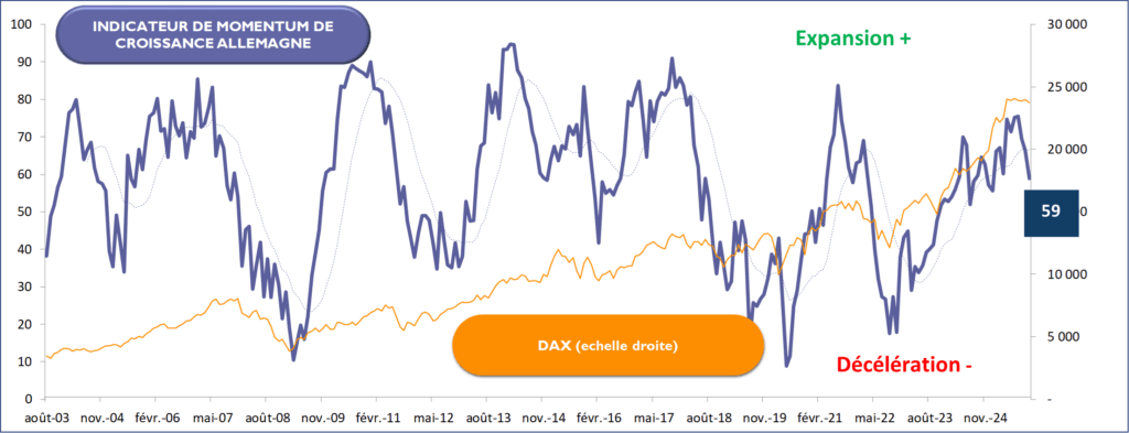 L’Allemagne doute. De sa puissance économique et commerciale, de sa solidité sociale, de ses alliés géostratégiques, de son leadership politique. Elle peut sans doute se rassurer si elle se compare à son voisin de l’autre côté du Rhin, mais cela ne suffit pas à chasser les nuages. Notre indicateur Montpensier Arbevel de Momentum économique à 59, demeure pourtant résolument en territoire d’expansion. Mais, si l’impulsion est meilleure qu’il y a quelques mois, le niveau absolu de nombreux indicateurs demeure inquiétant. A commencer par le socle traditionnel du modèle économique d’Outre-Rhin, l’industrie.
